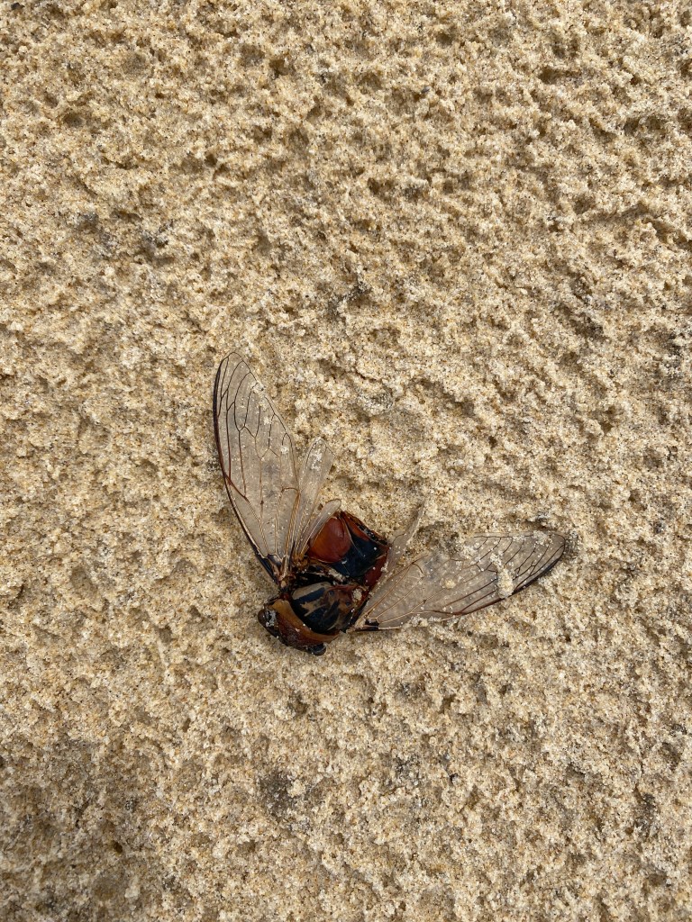 It’s impossible not to think this way when death is an omnipresent feature of Fiona Beach. the shoreline is littered with thousands of cicadas, dead or in the throes of dying. My best guess is that the wind sweeps their papery carcasses from the adjacent bush out to sea, before the swell brings them back in again.